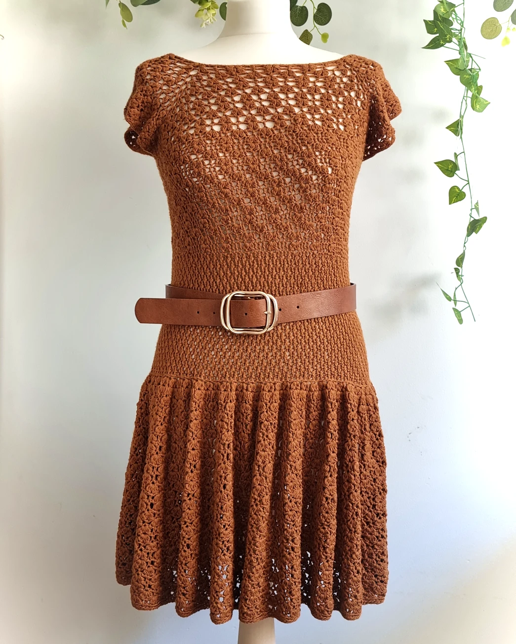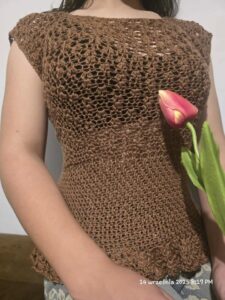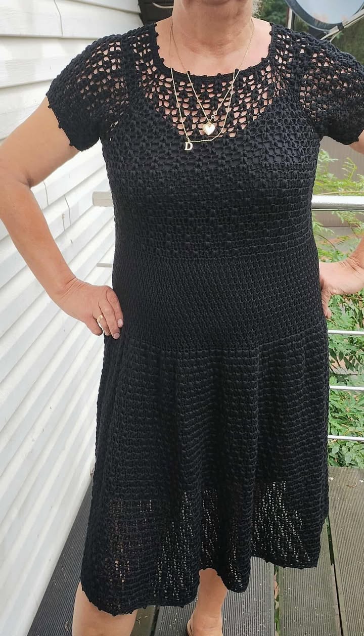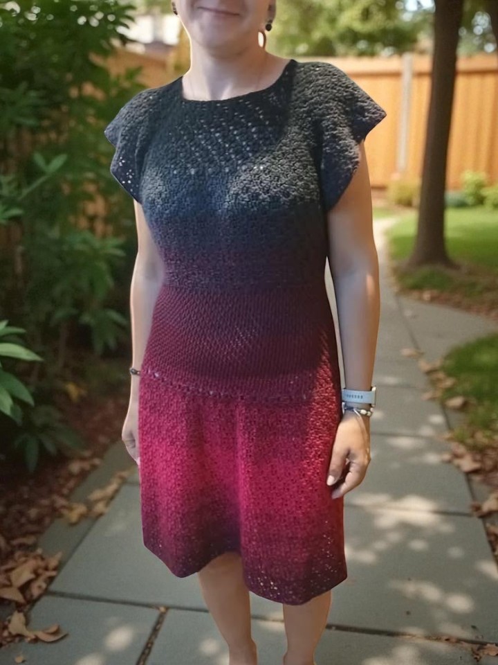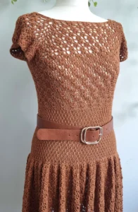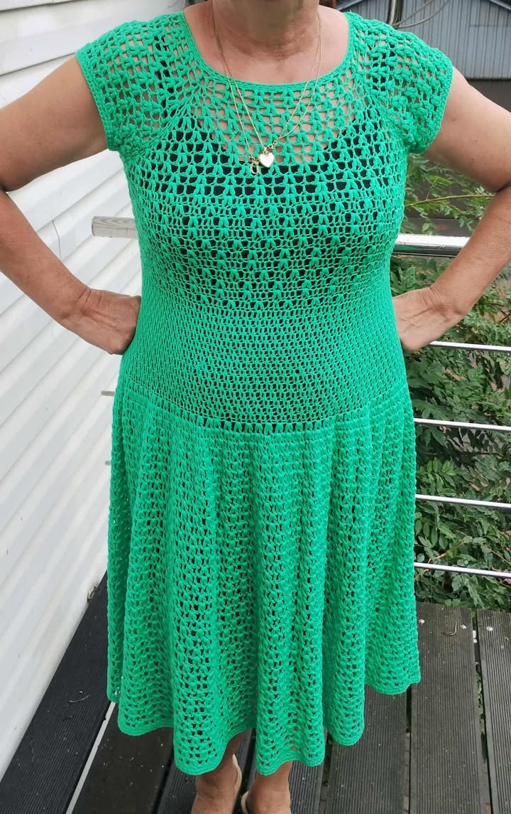 Jest to sukienka idealna nie tylko na lato, ale i jesienią – ze względu na użyty ścieg i włóczkę może z powodzeniem być noszona jako warstwa „pod coś” – pod dżinsówkę czy pod płaszcz.