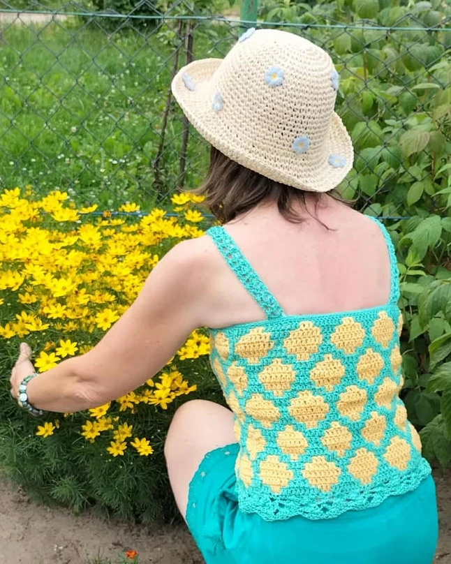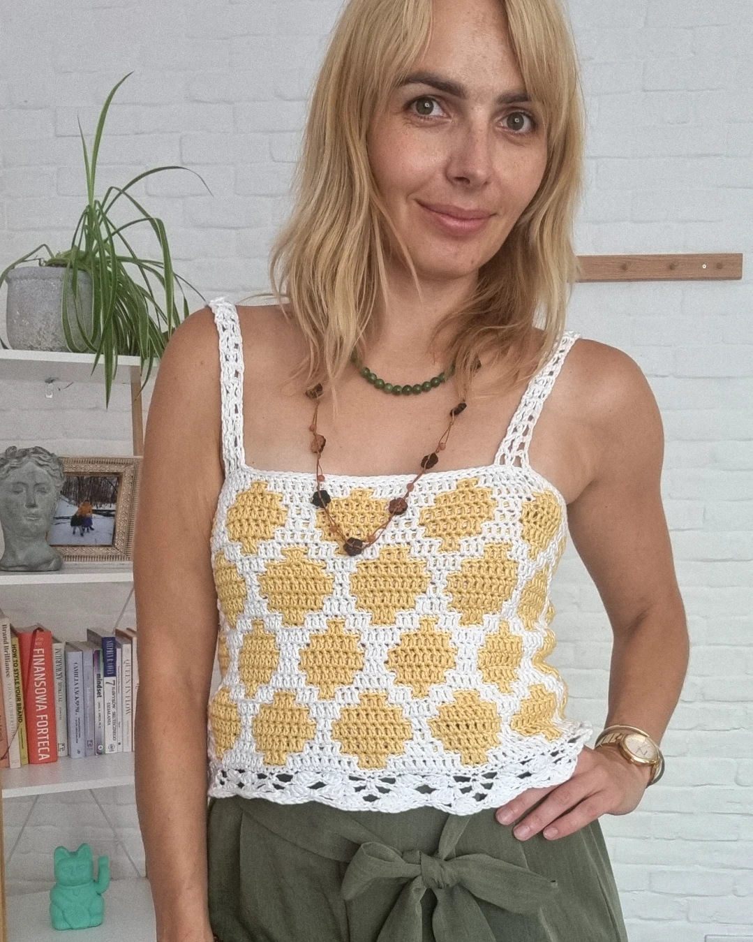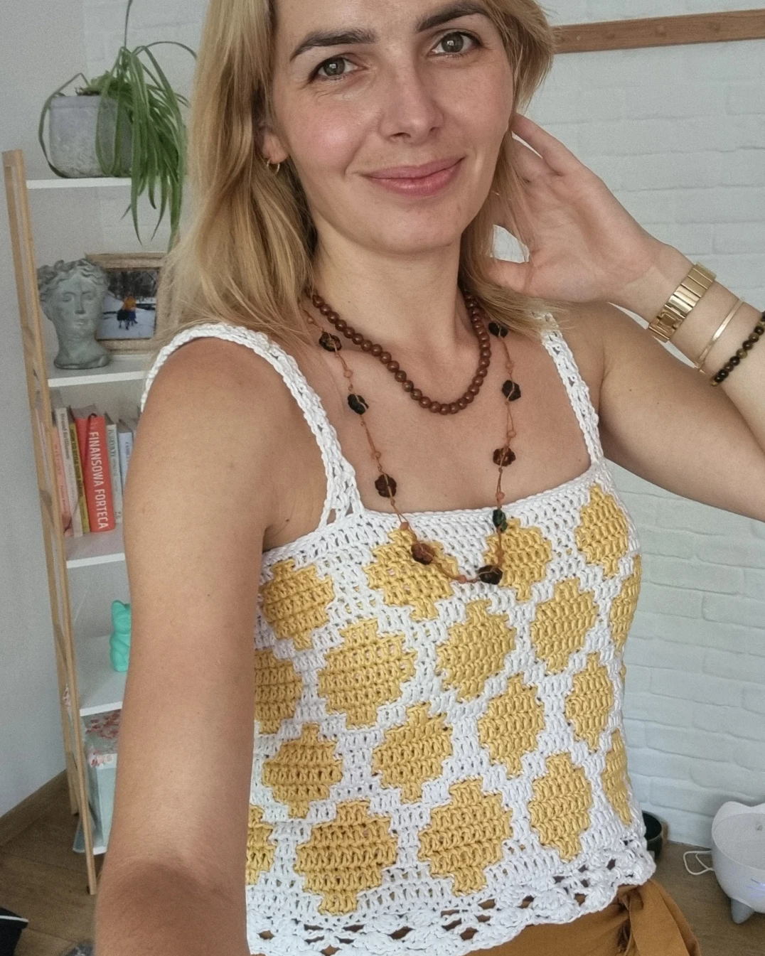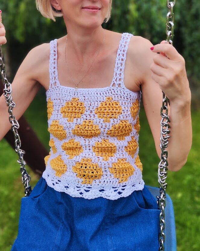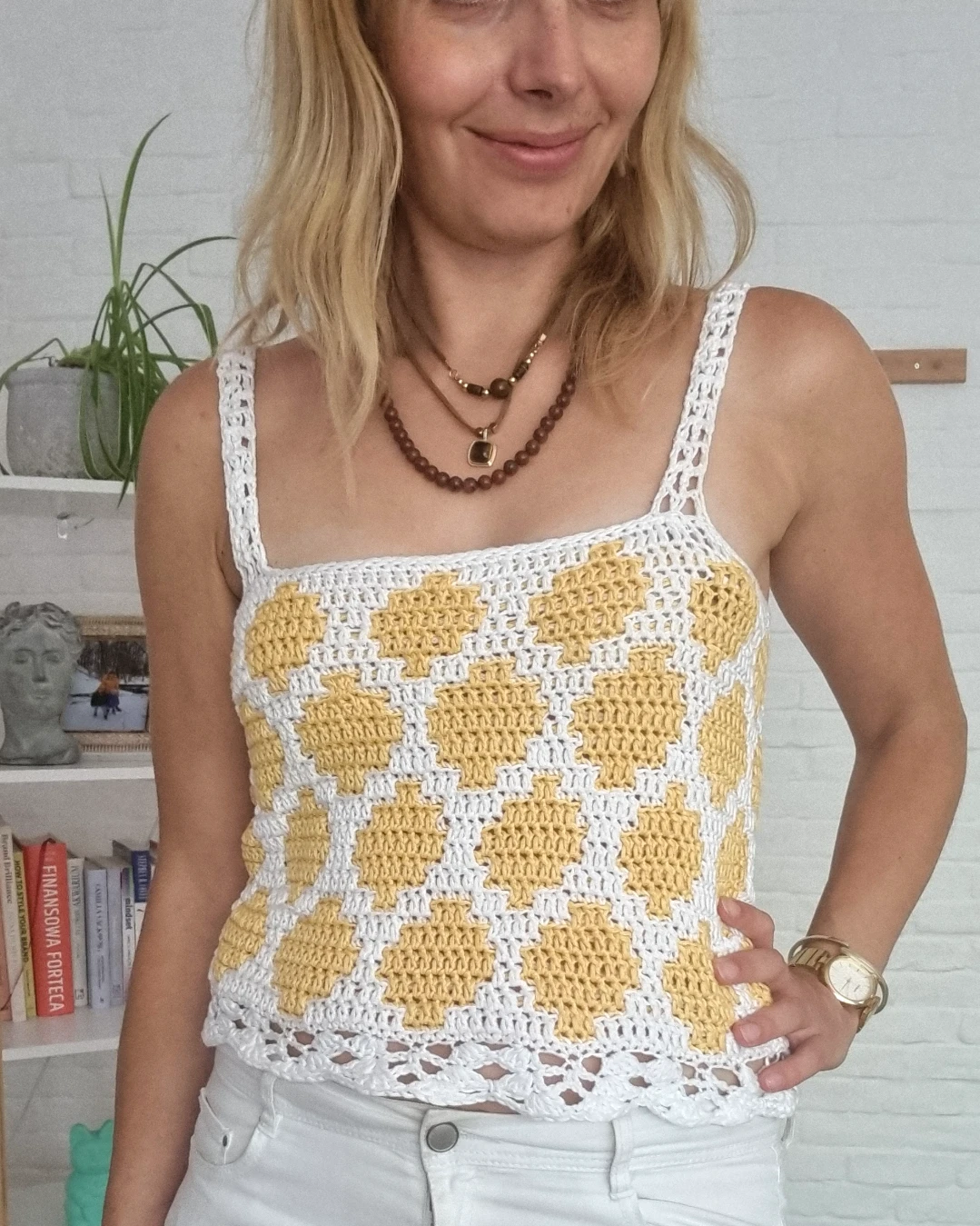 Letni, szydełkowy top z motywem cytrynek w technice mozaiki