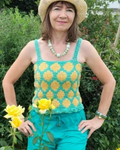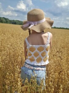 Top Lemoniada to pełen letniej energii wzór szydełkowy stworzony z myślą o dziewczynach małych i dużych. Wyrazisty motyw mozaikowych cytrynek na tle bieli (lub mięty!) przyciąga wzrok i wywołuje uśmiech – to projekt, który aż pachnie wakacjami!