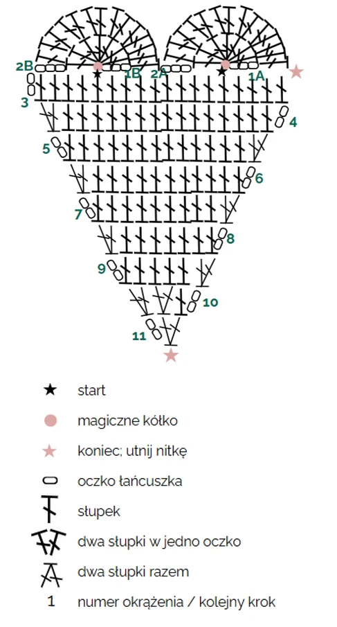 R11 W tym rzędzie zrób 2 OŁ i omiń pierwsze oczko, zacznij szydełkować słupki dopiero od drugiego słupka z poprzedniego rzędu. Następnie wykonaj ostatni raz dwa słupki razem.